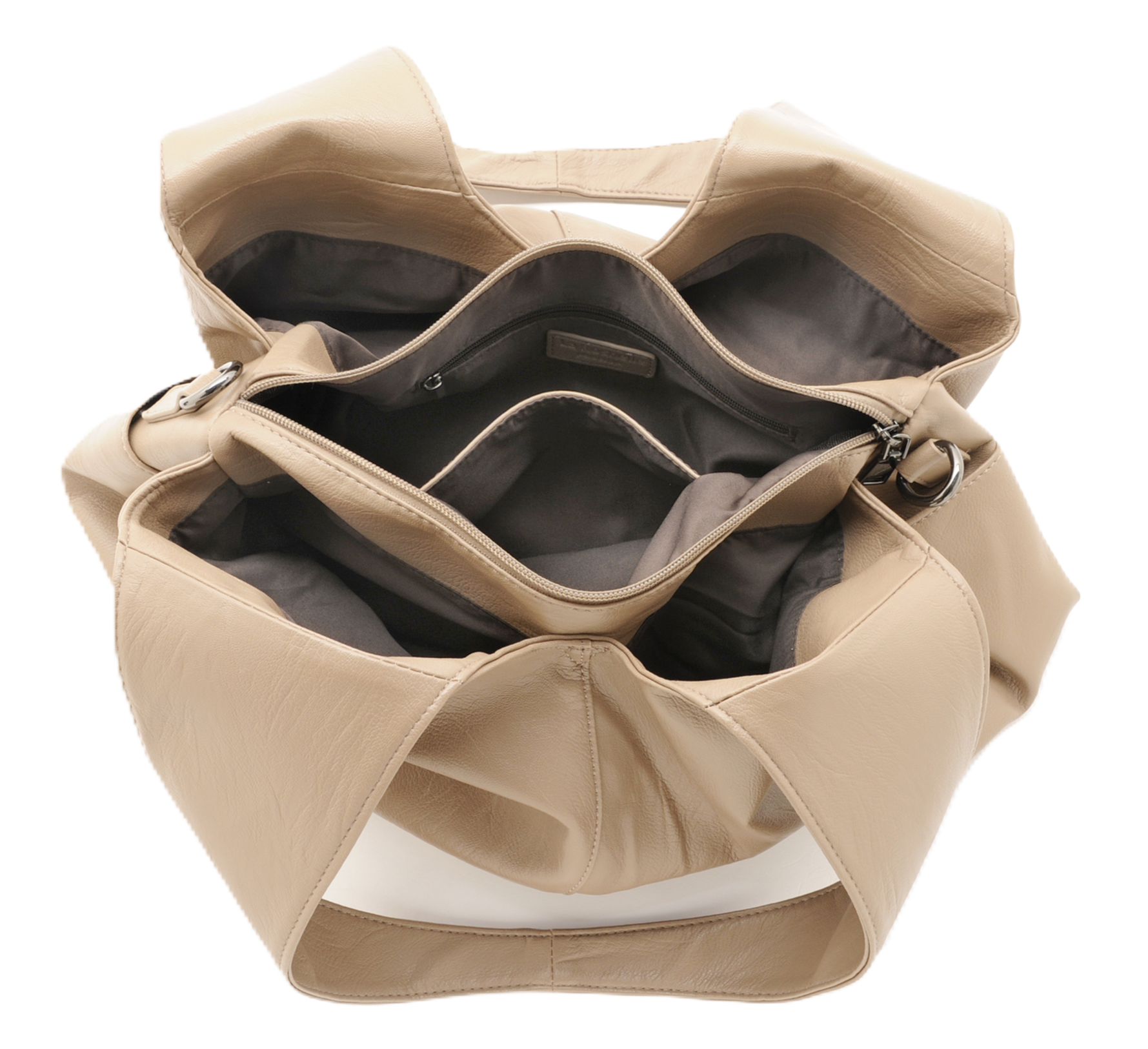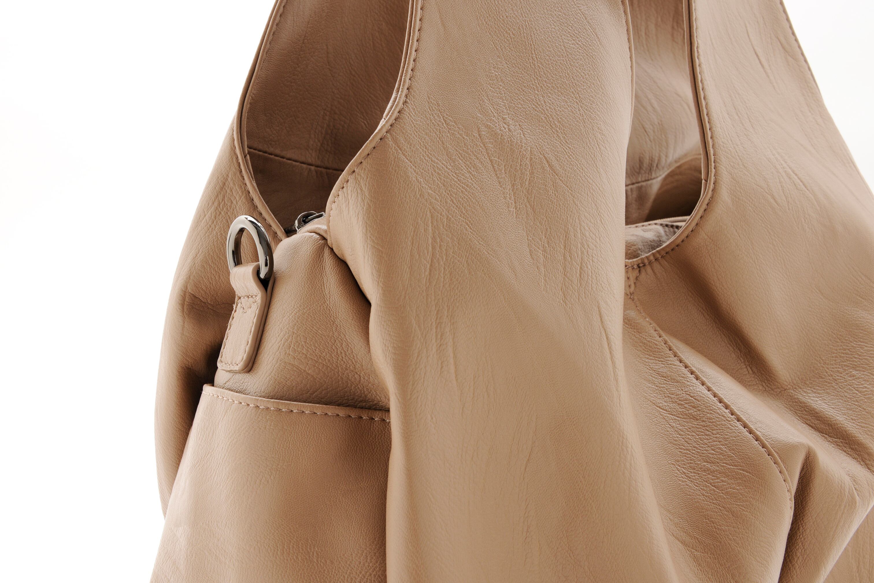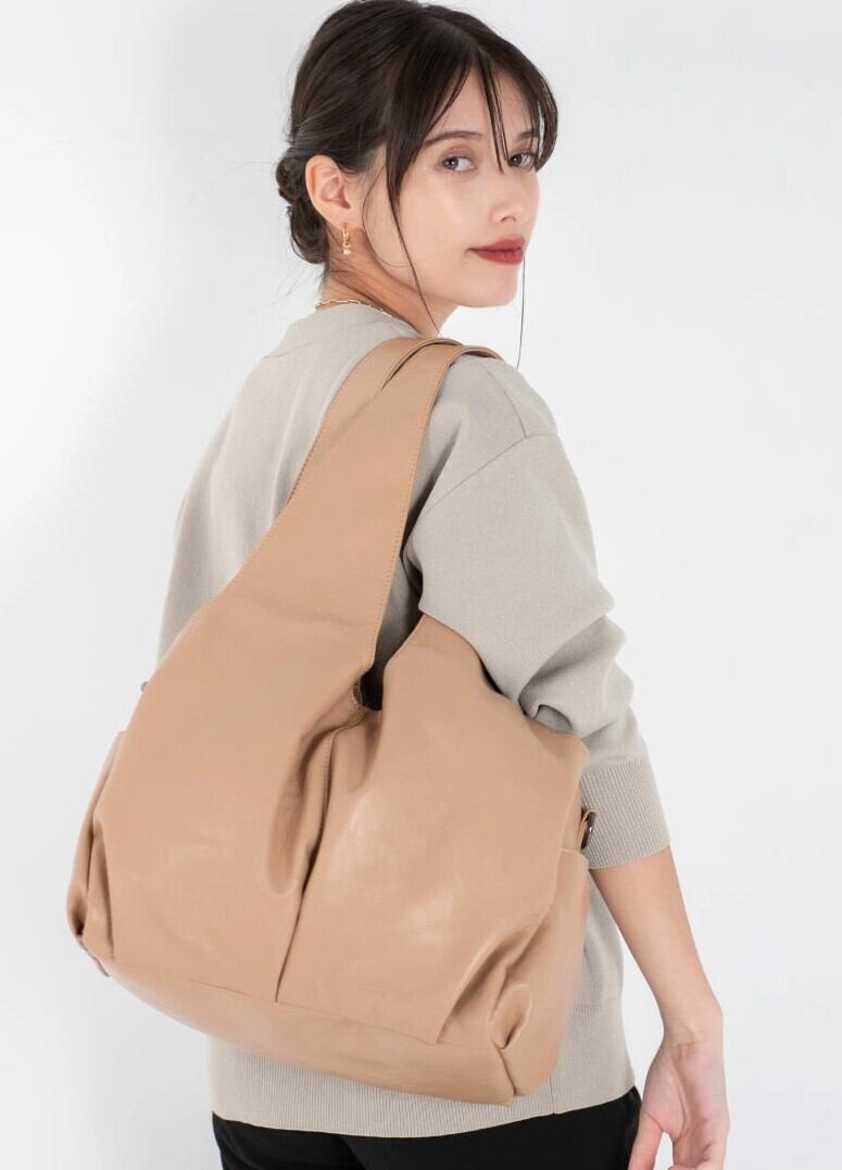 柔らかく扱いやすい生地感でくたっと感が愛らしいトートバッグ。前後には深めのオープンポケットが2つずつ付いていて、小物の収納に役立ちます。中央の開閉はファスナー仕様なので、貴重品も安心して持ち歩けます。長めのハンドルが肩にかけやすく、コートなどの羽織ものを着ている時もストレスフリーでお使いいただけます。ボリューム感のある軽い生地でこなれ感溢れるデザイン。ハンドルを倒してまとめるとコンパクトになり、ショルダースタイルにも馴染みます。
